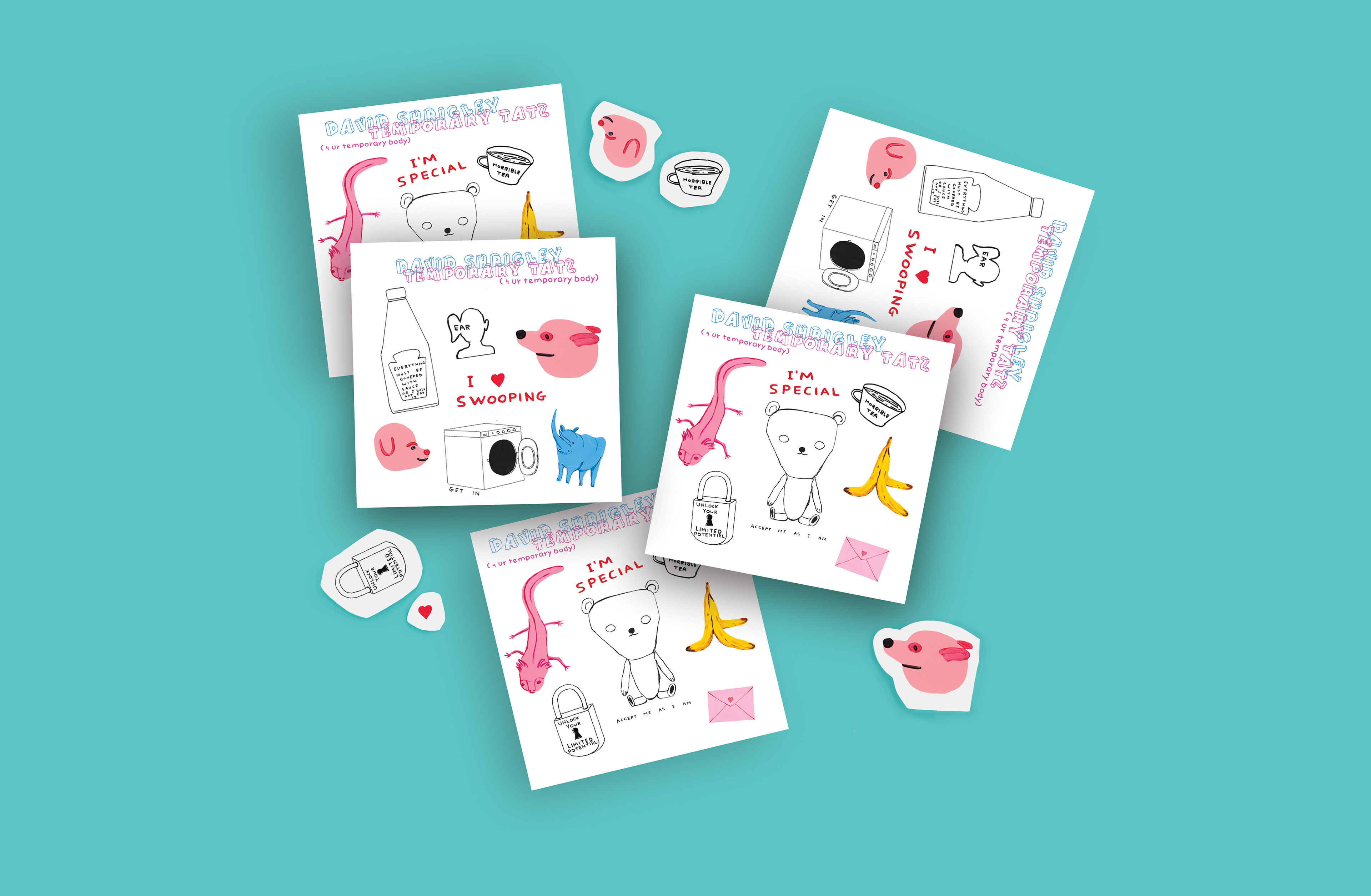 While there is already Shrigley merch in existence, I wanted to further this collection by means of utilizing unused designs and presenting a new item-"Temporary Tatz”.