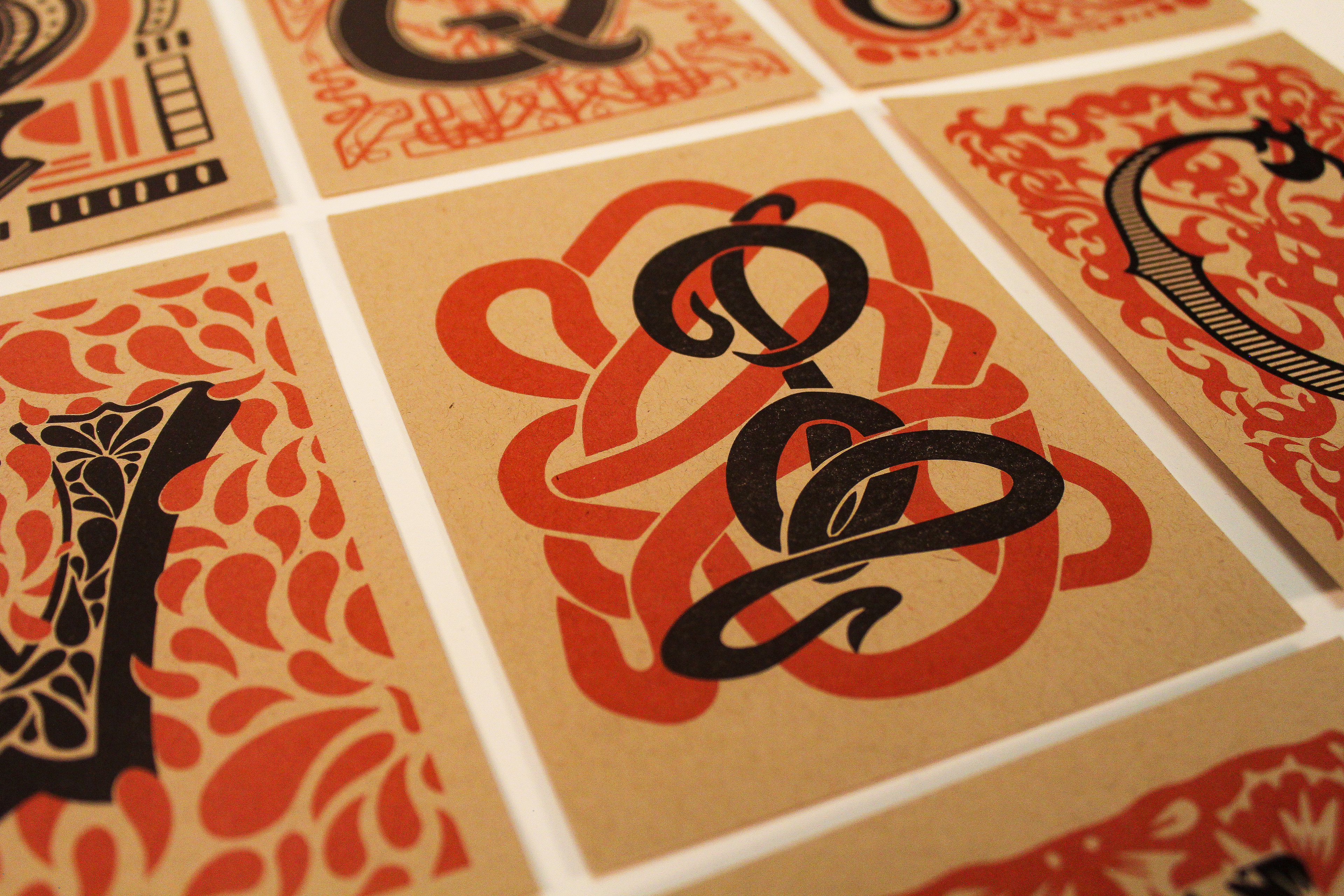 A collaborative drop caps alphabet; designed and letter pressed with 20 other creators. I designed the letters “P” and “Q” for the set.